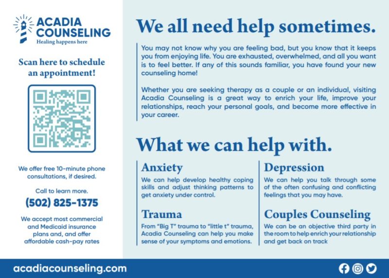 Acadia Counseling is a woman-owned private mental health counseling practice, with locations in St. Matthews and Murray, Kentucky. Our talented licensed professional counselors conduct sessions in-person and via telehealth six days a week with evening and weekend appointments available. We accept most major insurance plans (Anthem, Aetna, Cigna, United Healthcare) as well as Medicare traditional and supplement plans. We also take all forms of Kentucky Medicaid (Humana Healthy Horizons, Aetna Better Health, Anthem, UHC, and “straight” Medicaid). We do all the billing for you and utilize a Client Portal system so you can schedule appointments, see upcoming appointments, and view your account balance at anytime, 24/7.