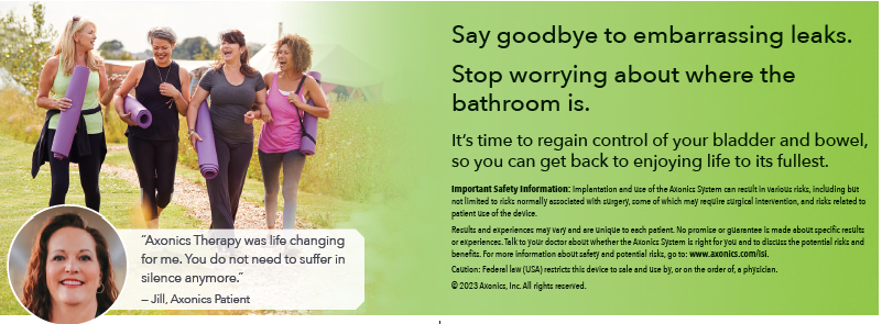Axonics therapy is an effective solution for treating symptoms of bowel incontinence, Overactive Bladder including urinary urgengy incontinence and urinary retention.