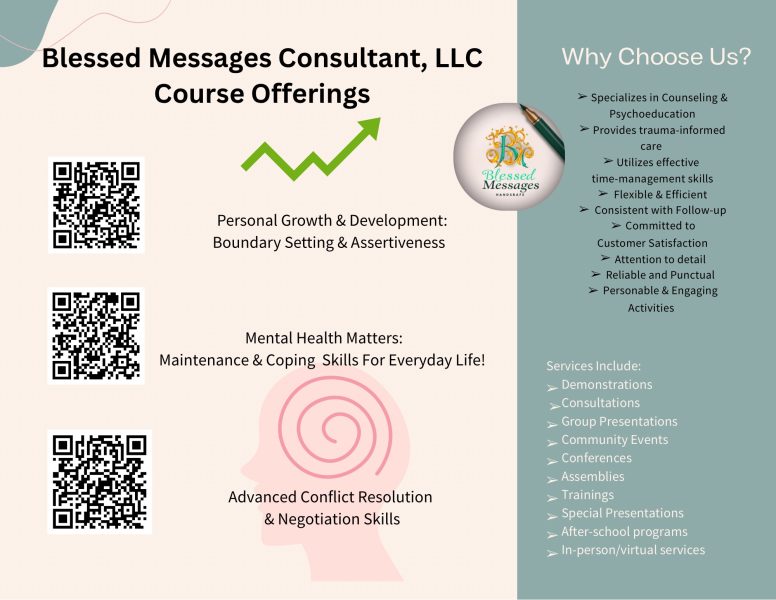 Blessed Messages Consultant, LLC is owned and operated by Niger Alabi who has served as a mental health professional for the last 18 years. Blessed Messages Consultant, LLC provides consulting services to various community organizations such as schools, churches, youth groups, camps, and nursing homes during special events and assemblies, on a long-term or short-term contractual basis. Our services include panel discussions, meetings, presentations, and programs on social-emotional learning and mental wellness, based on curriculum developed by the company’s creator. Consulting services can be held in-person or virtually.
