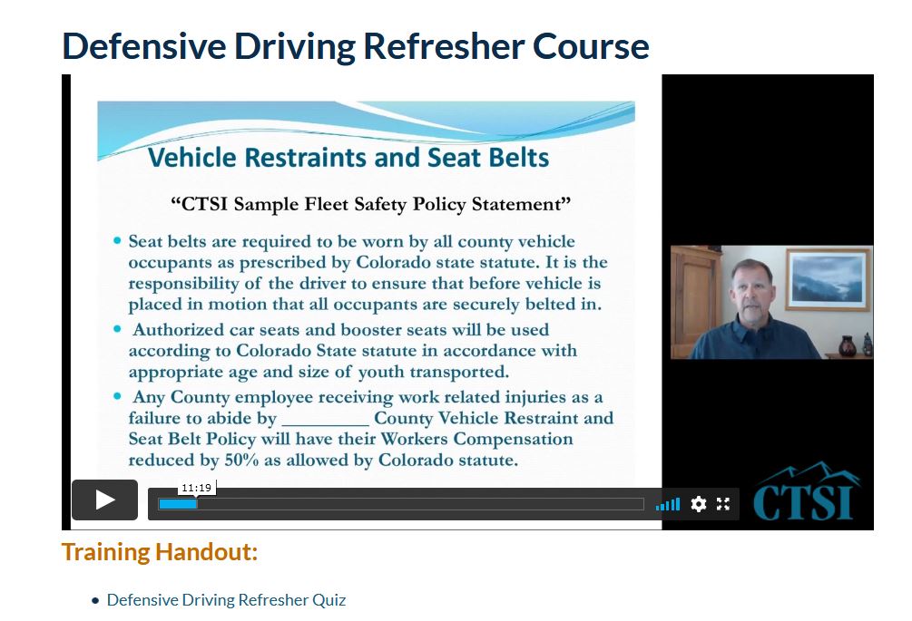 CTSI is a member-owned risk sharing insurance pool for Colorado counties providing the coverages for operations in liability, auto, property, worker’s compensation and employee healthcare. CTSI’s Loss Control Department offers counties specialized training adapted to meet the needs and to limit the risks each county faces, and demonstrates one of the benefits counties derive from pooling their resources. Few member counties would individually be able to afford the depth and breadth of loss control and safety expertise offered by CTSI’s team of safety professionals, trainers, and problem solvers. CTSI provides members with timely technical updates, loss control classes, webinars, and a film and reference library designed to give members the tools they need to lower risk and control costs.