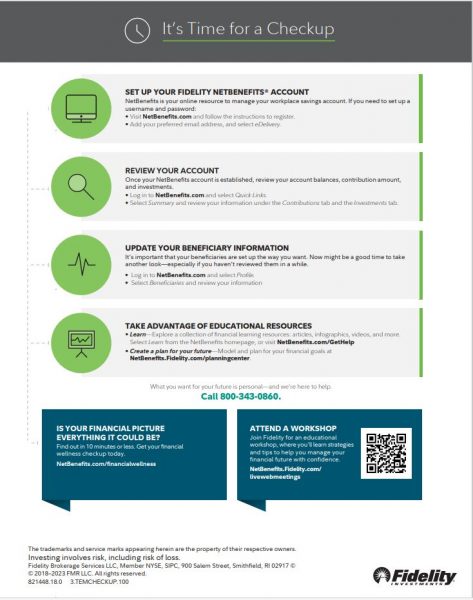 The Fidelity associate will answer questions about the Plan along with helping employees register and begin contributing to save for retirement.