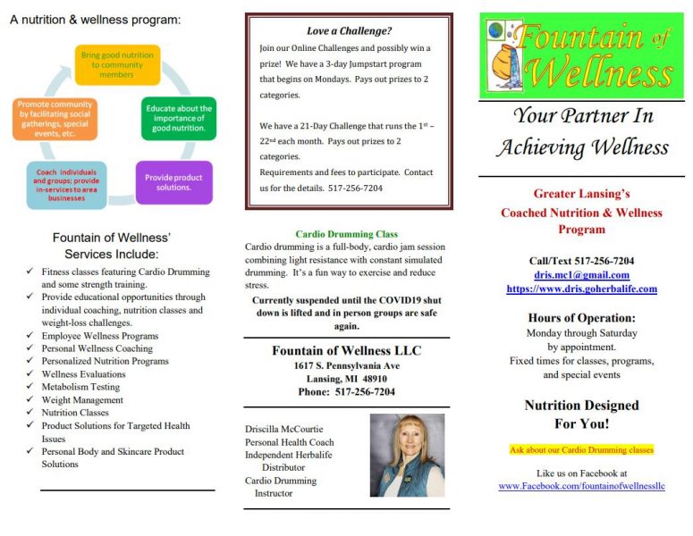 Our classes include nutrition classes, weight loss challenges which include nutritional education, and cardio drumming classes. **However, during this COVID19 situation, we are doing online challenges. When it is safe again, we will resume inperson activities.**