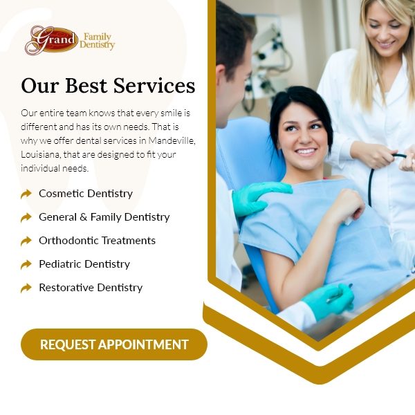 Grand Family Dentistry, your trusted dentist in Mandeville, LA, offers an array of services tailored to meet the unique needs of every smile. From enhancing alignments with advanced orthodontics treatment to restoring confidence with top-tier dental implants, our clinic ensures a holistic approach to dental health. Those seeking to beautify their smiles can explore our cosmetic dentistry options, designed to refine and perfect. At Grand Family Dentistry, we blend modern techniques with a compassionate touch, ensuring every patient walks away with a brighter, healthier smile. Trust in our expertise to provide unparalleled dental care for you and your family.