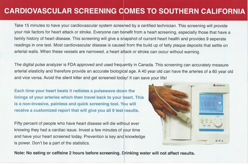 The digital pulse analyzer is an FDA approved and used frequently in Canada. This screening can accurately measure arterial elasticity and therefore provide an accurate biological age. A 40 year old can have the arteries of a 60 year old and visa versa. Avoid the silent killer and get screened today. This one minute test could save your life!