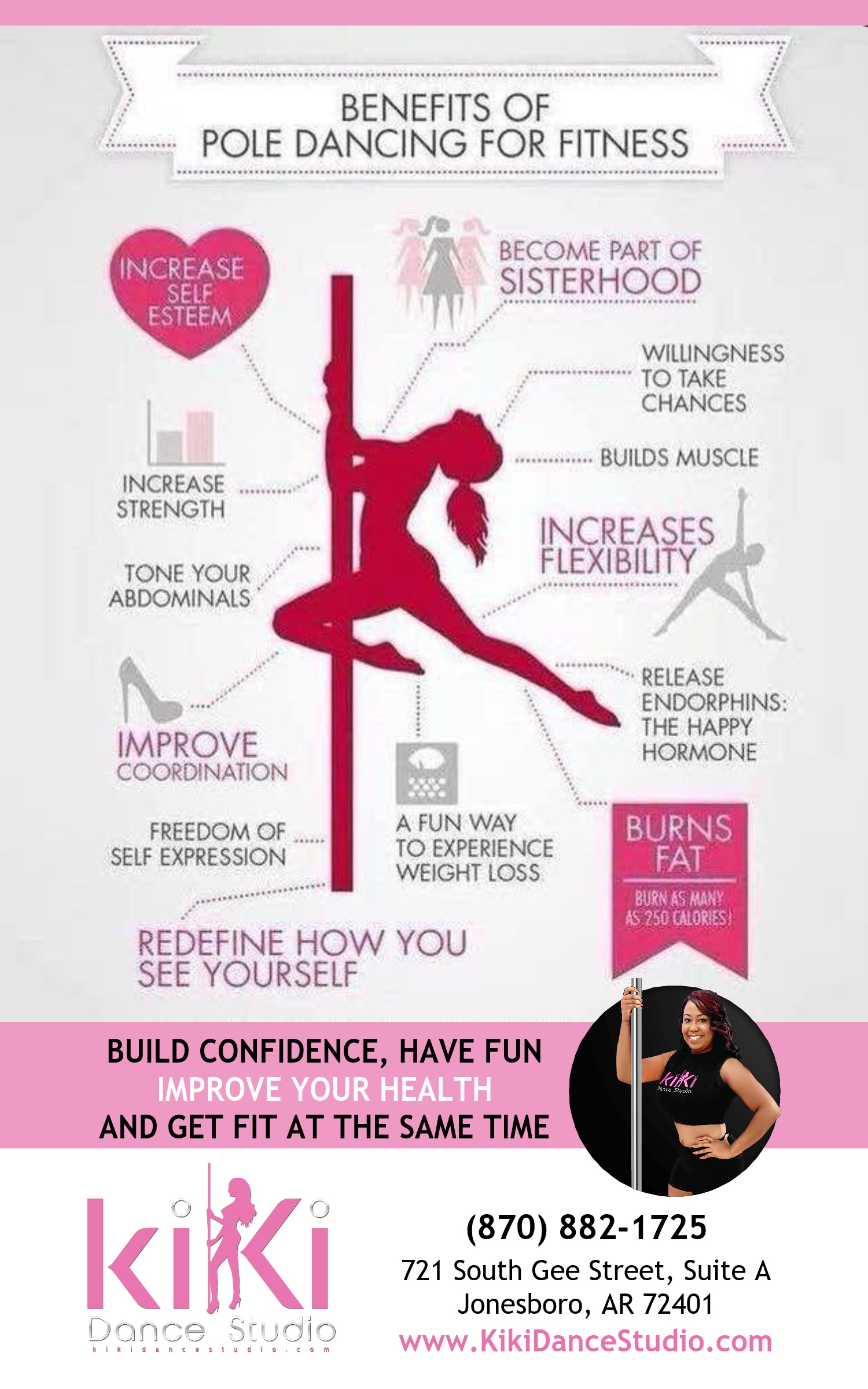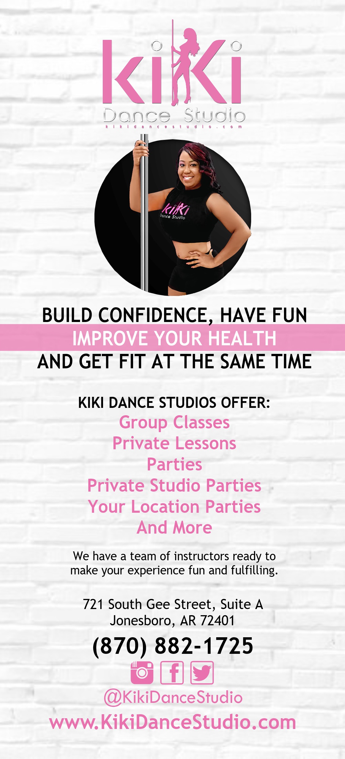 Kiki Dance studio is a Diverse Pole Fitness studio that offers a variety of exercises with the Pole to build strength and confidence while focusing on weight loss. We believe that Pole Fitness will provide a healthier and longer life. Pole fitness helps with your psychological and emotional health in reducing stress. We provide a safe and clean indoor playground for women with various body types that deal with anxiety, depression, high stress levels, newly moms, postpartum, joint complications and more. Our mission is to provide a warm, supportive and creative atmosphere to satisfy customers through core conditioning, flexibility training and Pole Fitness. Kiki Dance Studio is a place where you can feel comfortable, attractive while increasing your self- confidence and self-esteem.