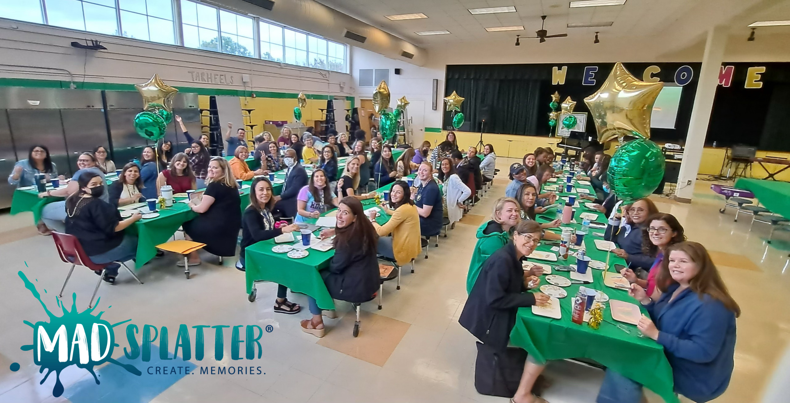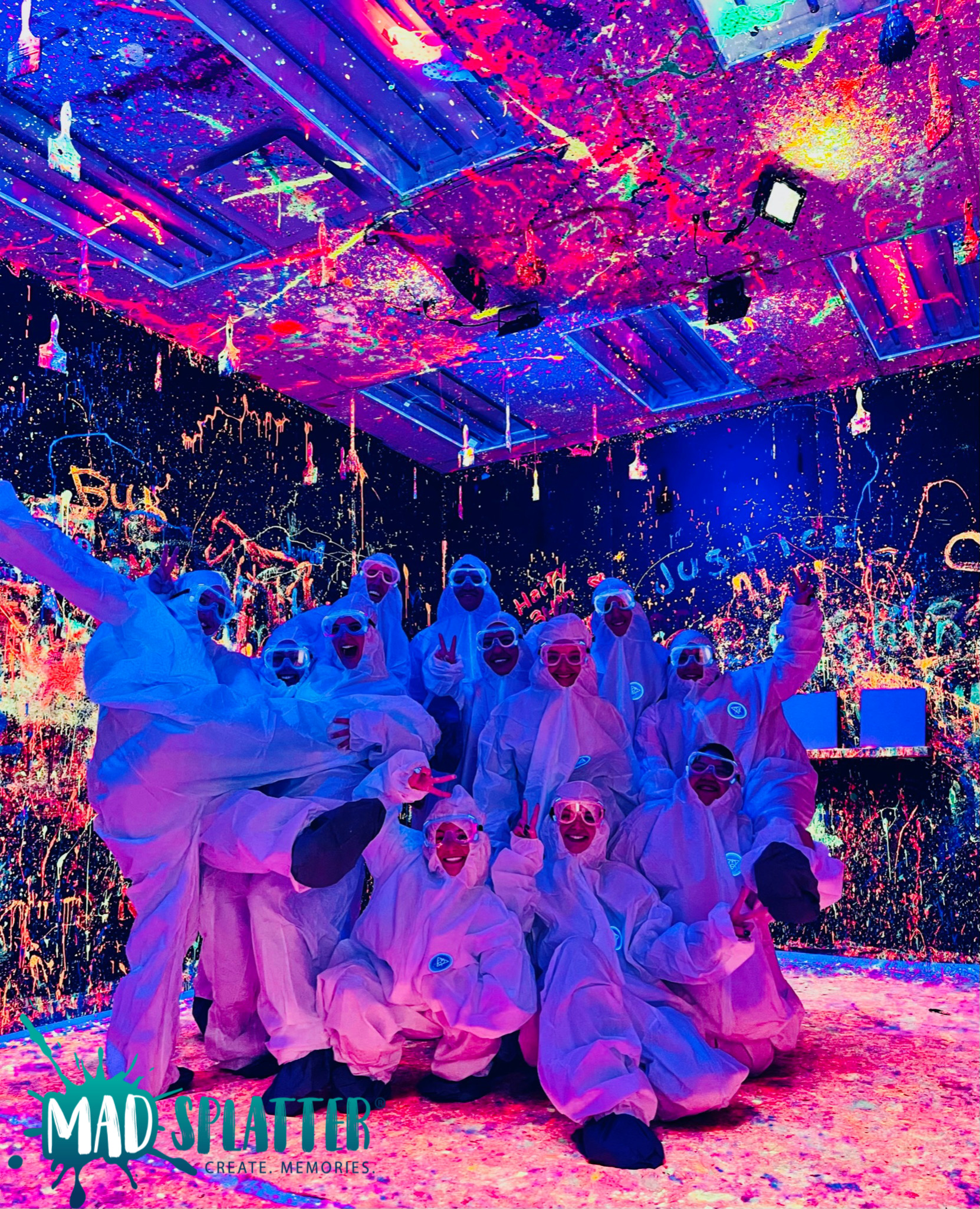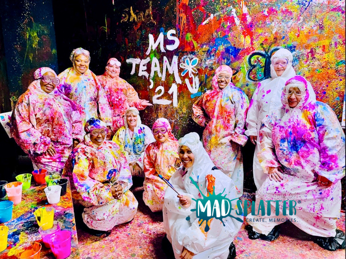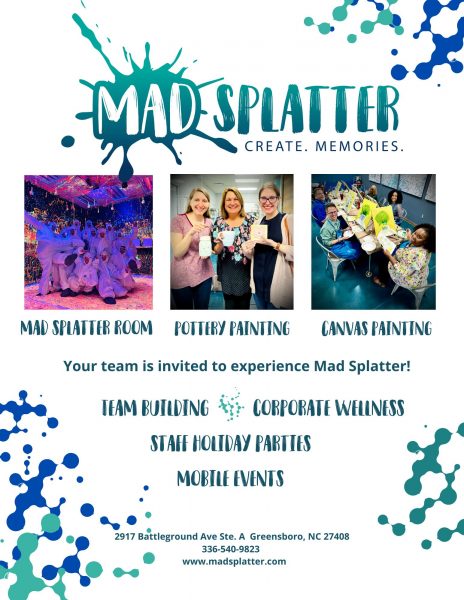 Some of our services include: Pottery Painting, Canvas Design painting and of course our wildly famous Mad Splatter Rooms in a Splatter Painting setting. We have a large 7,000 sqaure foot location for customers to spread out, and also offer our services mobile and remotely to help local businesses create memories together in the workplace and bring organizations closer together for a more cohesive warm work environment.