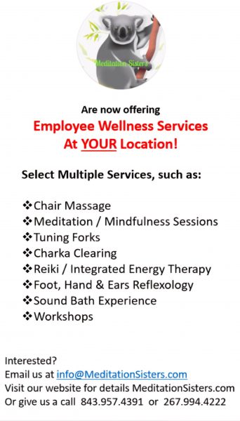 We offer many wellness services including Meditation & Mindfullness training; Massage; Reiki; Tuning Forks; Clinical Cupping; Reflexology; Tranquil Hospice services for patients and families; Home Blessings; Sound Healing Events; Workshops and muh more.
