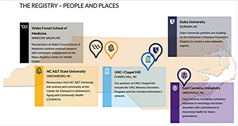 The NC Registry for Brain Health is the first of its kind in the state of North Carolina. The Registry is designed to increase awareness of Alzheimer’s disease and related disorders and to connect North Carolinians of all ages to research opportunities designed to improve brain health. When you join the NC Registry for Brain Health, you will learn about research taking place at Duke University, East Carolina University, North Carolina A&T State University, the University of North Carolina at Chapel Hill and Wake Forest School of Medicine.