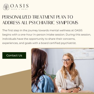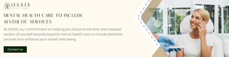 OASIS Mind and Body is dedicated to your mental and physical wellness. Our primary services include supportive psychotherapy, aesthetic services, and personalized medication management services for patients 15 and older. We foster your overall wellness through meticulously tailored care, seamlessly integrating medication management services with holistic support. Our goal is to empower our patient’s to be active participants in feeling and being the best version of themselves. At OASIS, you can also find a diverse range of therapeutic modalities, including cognitive behavioral therapy, applied behavioral analysis, and drama & expressive arts therapy to address your mental health needs comprehensively. Additionally, our facility offers several private amenities and provides rejuvenating aesthetic services to enhance your overall well-being and confidence.