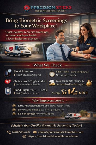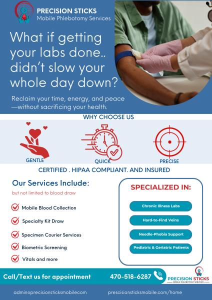 Precision Sticks Mobile Phlebotomy Services specializes in concierge, gentle, fast, and precise blood draws, with a focused niche in supporting patients managing chronic health conditions such as hypertension (HTN), type 2 diabetes (T2DM), high cholesterol, thyroid disorders, and other long-term conditions.