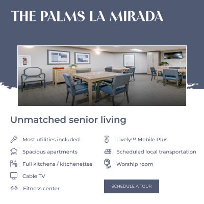 The Palms La Mirada is a premier choice for senior living in La Mirada, CA with spacious apartments. Residents can enjoy Independent Living with access to beautiful gardens and weekly outings that make this luxury retirement community special. Our Independent Living apartments are thoughtfully designed to provide comfort and convenience. Our senior living facility also guarantees that you have everything needed to live an active, fulfilling lifestyle. Your stay at our retirement community comes with plenty of opportunities to engage with neighbors and participate in exciting activities. Experience the perfect balance of independence, luxury, and community.