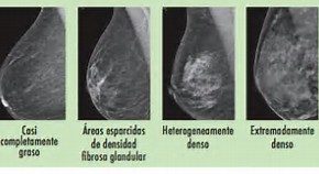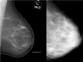 - Did you know that dense breast tissue is comprised of less fat and more connective tissue which appears white on a mammogram. Cancer also appears white thus tumors are often hidden or masked by the dense tissue. As a woman ages, her breasts usually become more fatty. However, 2/3 of pre-menopausal and 1/4 of post menopausal women (40%) have dense breast tissue. Additionally, as the density of the breast increases, the risk of breast cancer also increases.