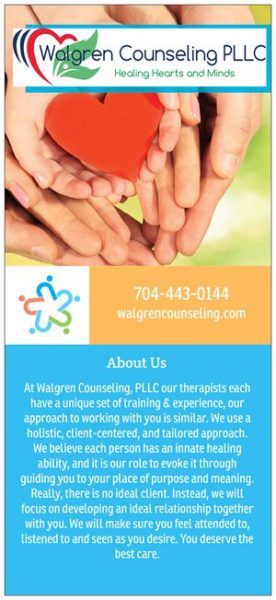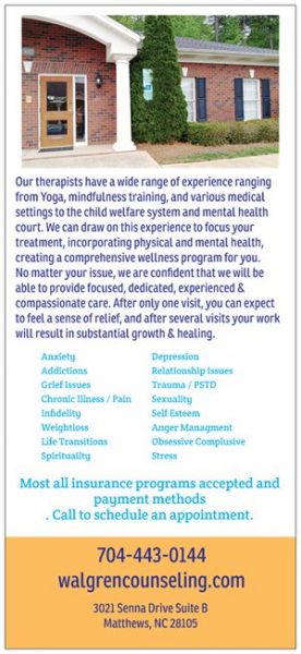 Walgren Counseling, PLLC is a mental health center devoted to excellence in Behavioral Health Services for Charlotte, NC. We offer family counseling, couples and marriage counseling, individual as well as child therapy.