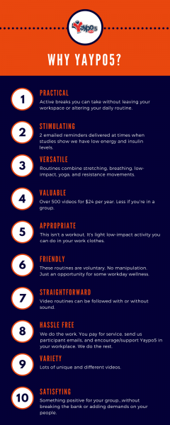 Yaypo is a cloud-based/virtual workday physical wellness company.
